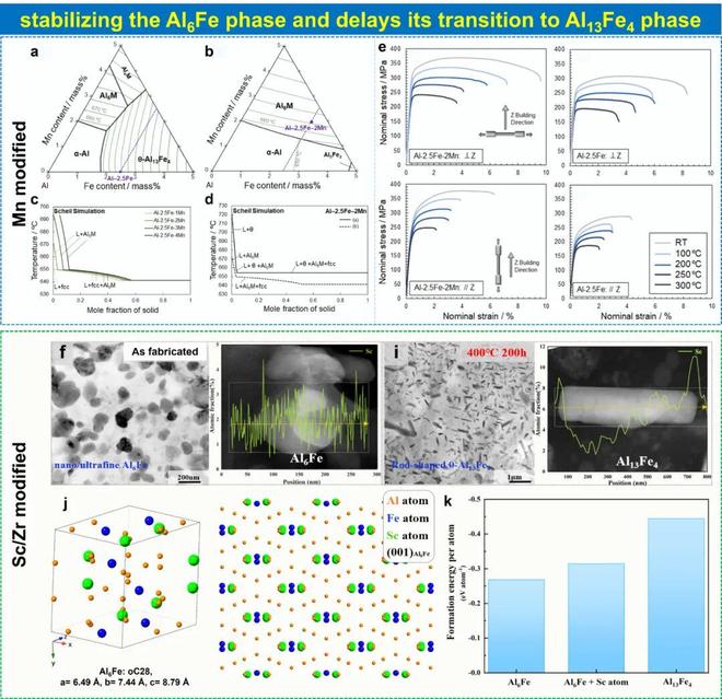 图11 铝铁合金抑制θ相形成的策略。研究人员尝试通过添加锰、钪、锆等元素来稳定Al6Fe合金