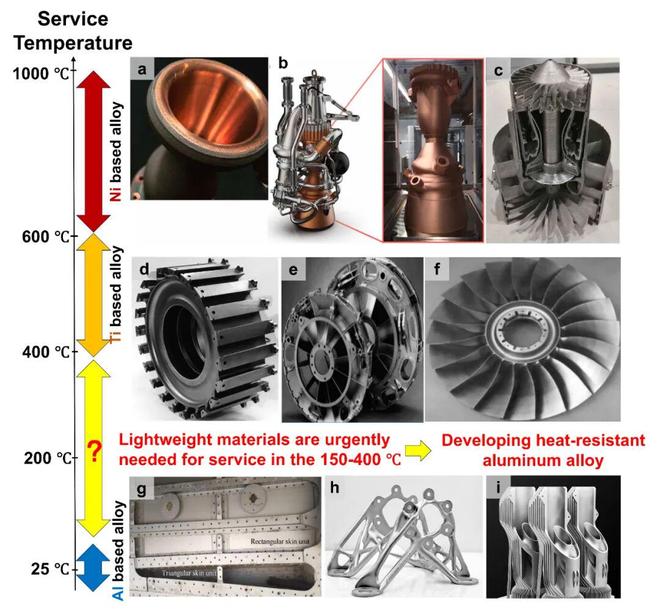 随着航天器、航空发动机等高端设备的快速发展,对具有优异高温性能的金属材料需求日益增长。这类材料需要具备“高强度、轻量化和卓越高温性能”三大特性。虽然能够承受600℃以上高温的镍基高温合金仍占主流,但市场对200-400范围(图1)的材料需求持续攀升。尽管钛合金能满足这一温度要求,但采用铝(Al)合金(密度2.7g/cm³)替代钛合金(密度4.05g/cm³)可实现约40%的减重效果,这展现出显著的轻量化优势。因此,耐高温铝合金的研发不仅有助于降低材料成本,更能推动设备轻量化进程。