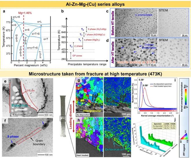 图17(a,b)铝锌镁铜合金相图及其对应的析出温度范围;(c)热处理试样高温拉伸试验前后的扫描透射电镜图像。(e)沉积态试样与(f)热处理试样的明场TEM图像。(g,h)高温拉伸试验后断裂截面的能量色散X射线衍射图谱(IPF)和金相分析图谱(KAM);(i)沉积态试样与热处理试样的金相分布及(j)取向图谱。