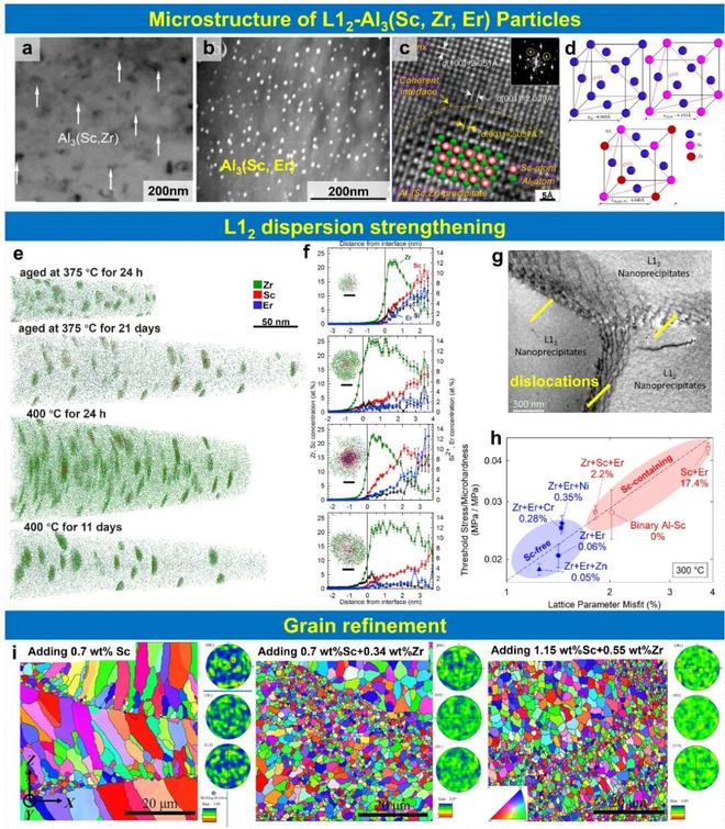 图22 L12颗粒的显微结构:(a)Al3(Sc,Zr);(b)Al3(Sc,Er);(c)纳米L12析出相与铝基体的界面;(d)Al、Al3Sc和Al3(Sc,Zr)晶胞示意图;(e)经640°C均质化8小时后,Al-0.08Zr-0.014Sc-0.008Er-0.10Si元素在375°C等温时效24小时和21天,或400°C等温时效24小时和11天的三维(3-D)原子位错点重构;(f)基体/析出相界面的浓度分布图。(g)L12颗粒的存在会阻碍位错运动。247(h)比较了基础合金(Zr + Er)、铬改性合金(Zr + Er + Cr)和锌改性合金(Zr + Er + Zn)在300°C蠕变测试中,L12纳米析出相的晶格参数失配与归一化阈值应力的对比;(i)不同钪、锆含量铝合金的异形相和非晶相。通过共改性钪和锆纳米颗粒成功引入均质超细等轴晶粒,这有助于形成预期的原位Al3(Sc,Zr)成核粒子。