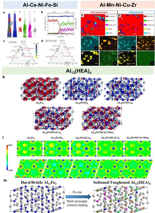 图21 (A)制备的Al-Ce-Ni-Fe-Si多组元合金的原子分布图,显示Al11Ce3和Al9(Ni,Fe)2析出相及其(b)元素分布。(c)制备态与(d) 400°C/144小时时效处理状态下的伪三元相图所示可能析出相。(e,h)铝锰镍铜锆多组元合金内部,等轴晶区与细晶区的析出相尺寸及形貌存在差异。(f,g,i,j)不同析出相颗粒对应显微图。(k)Al13Fe4型结构与Fe、Al亚晶格的电荷密度差。(l)Al13Fe4型结构与Fe、Al亚晶格在(100)晶面的电荷密度差。(m)通过铁位点多主元素掺杂实现Al13Fe4金属间化合物软化。