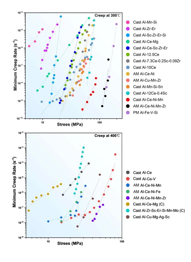 图20 AM耐热铝合金在拉伸或压缩(C)时的最小蠕变应变速率与应力的双对数图(a) 300°C和(b) 400°C