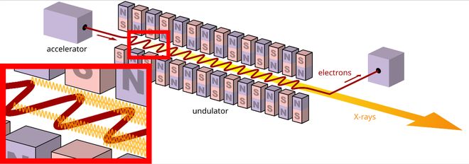 自由电子激光与传统激光的工作原理完全不同。传统激光通过激发物质中的电子跃迁来产生光,而自由电子激光则是利用高能的自由电子与强磁场作用来产生光。在这个过程中,电子束在磁场的作用下发生弯曲,每次弯曲都会释放出光子。由于电子束和磁场的参数可以人为调节,因此自由电子激光能够产生不同波长的、可精确调节的光。这种可以快速、灵活调节的特性,使得自由电子激光成为研究微观世界的理想光源,尤其在需要极短脉冲和高功率的实验中展现出独特优势。