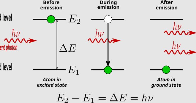 传统激光的原理:电子受激后从一个能级跳到另一个能级(E2—E1),从而释放出能量
