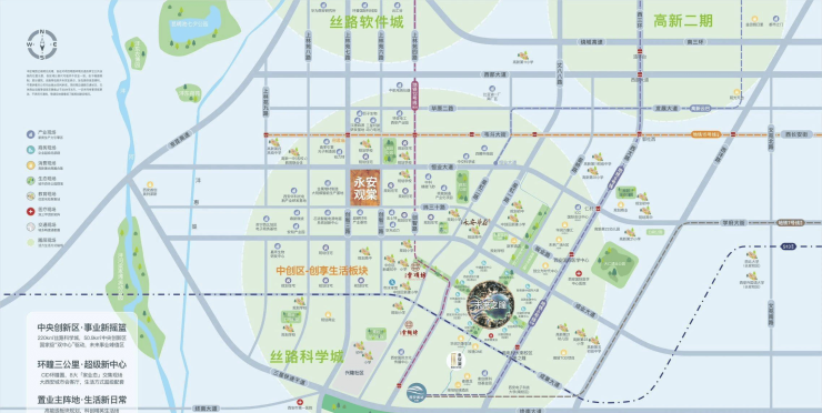 未来之瞳湿地公园、大仁遗址公园、永安渠Z字型水系景观。远眺秦岭自然山景,城市绿肺群集,毗邻百亩公园(拟规划)。